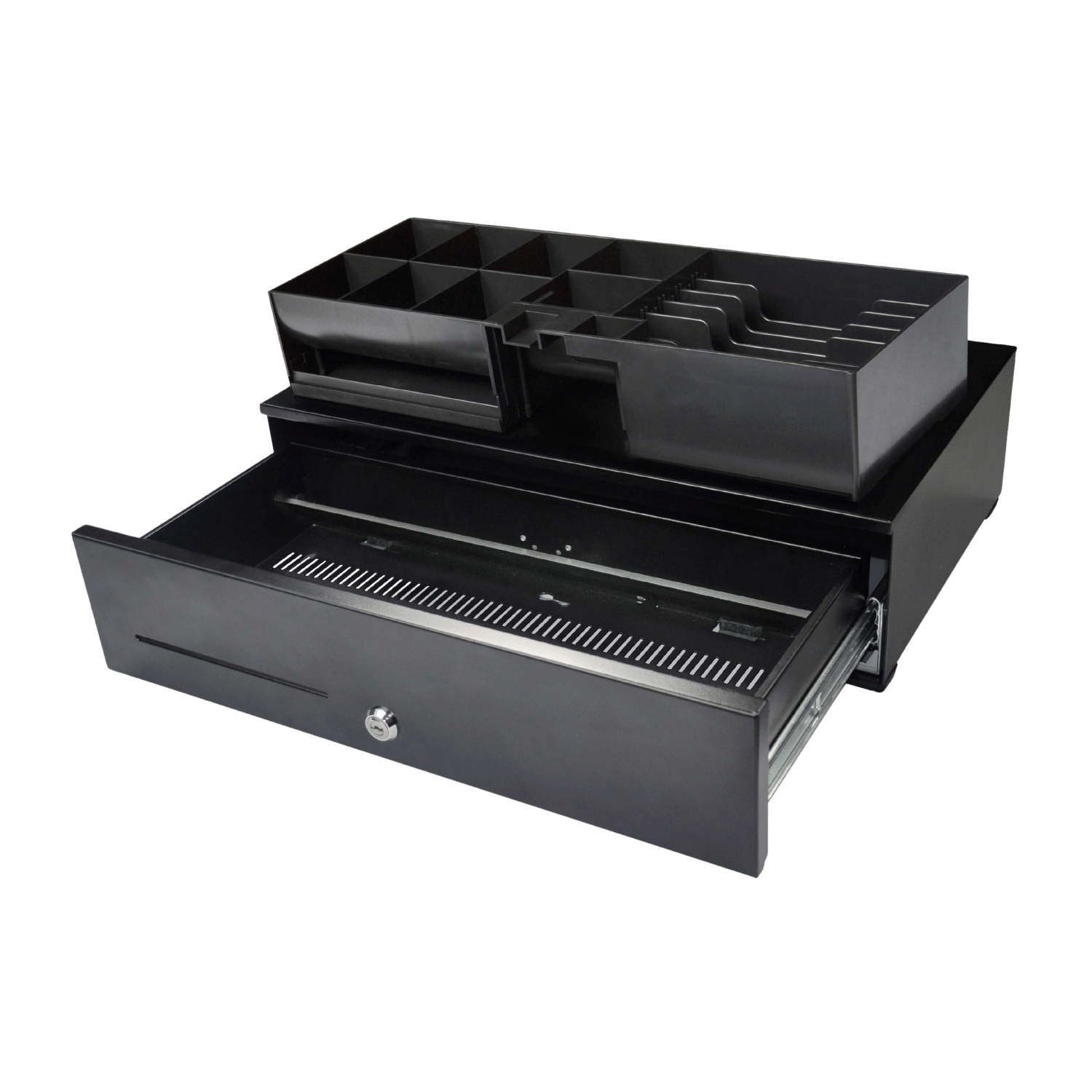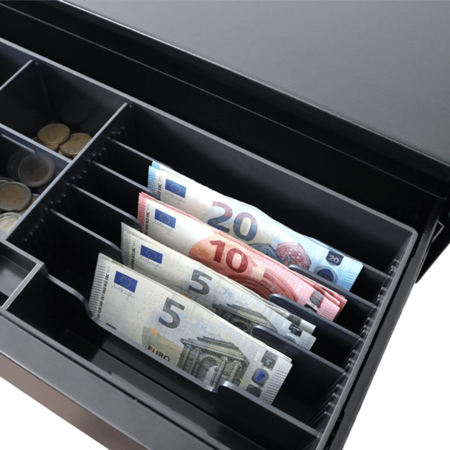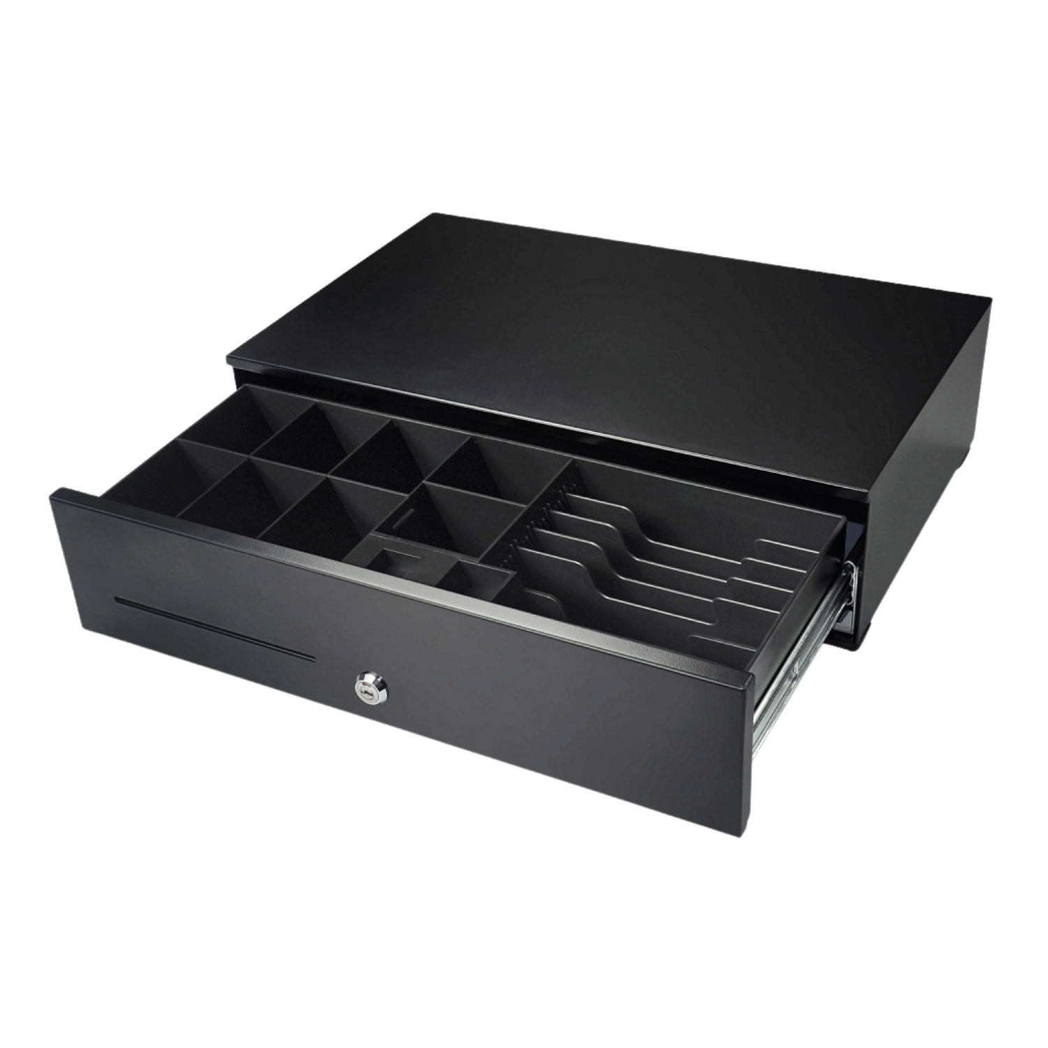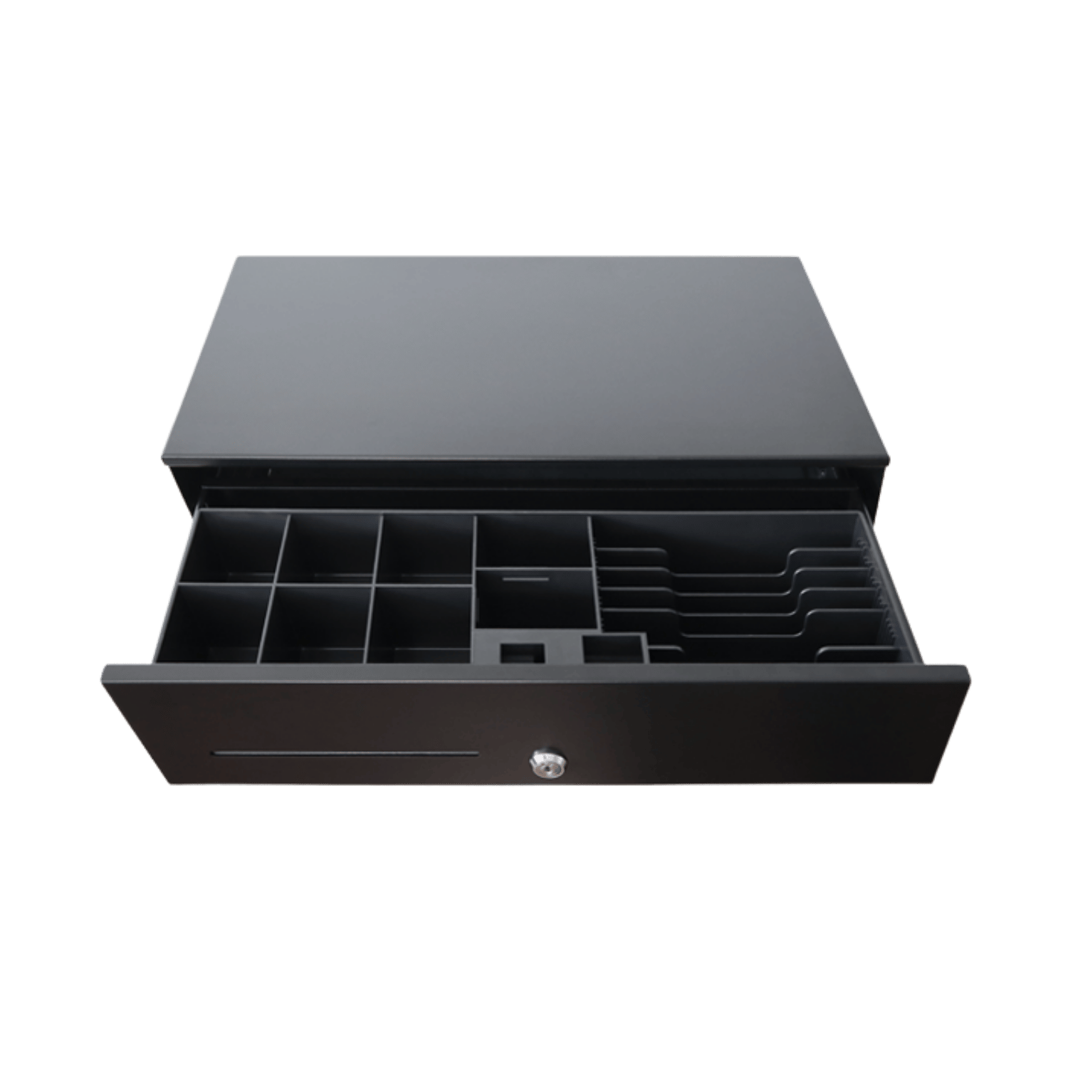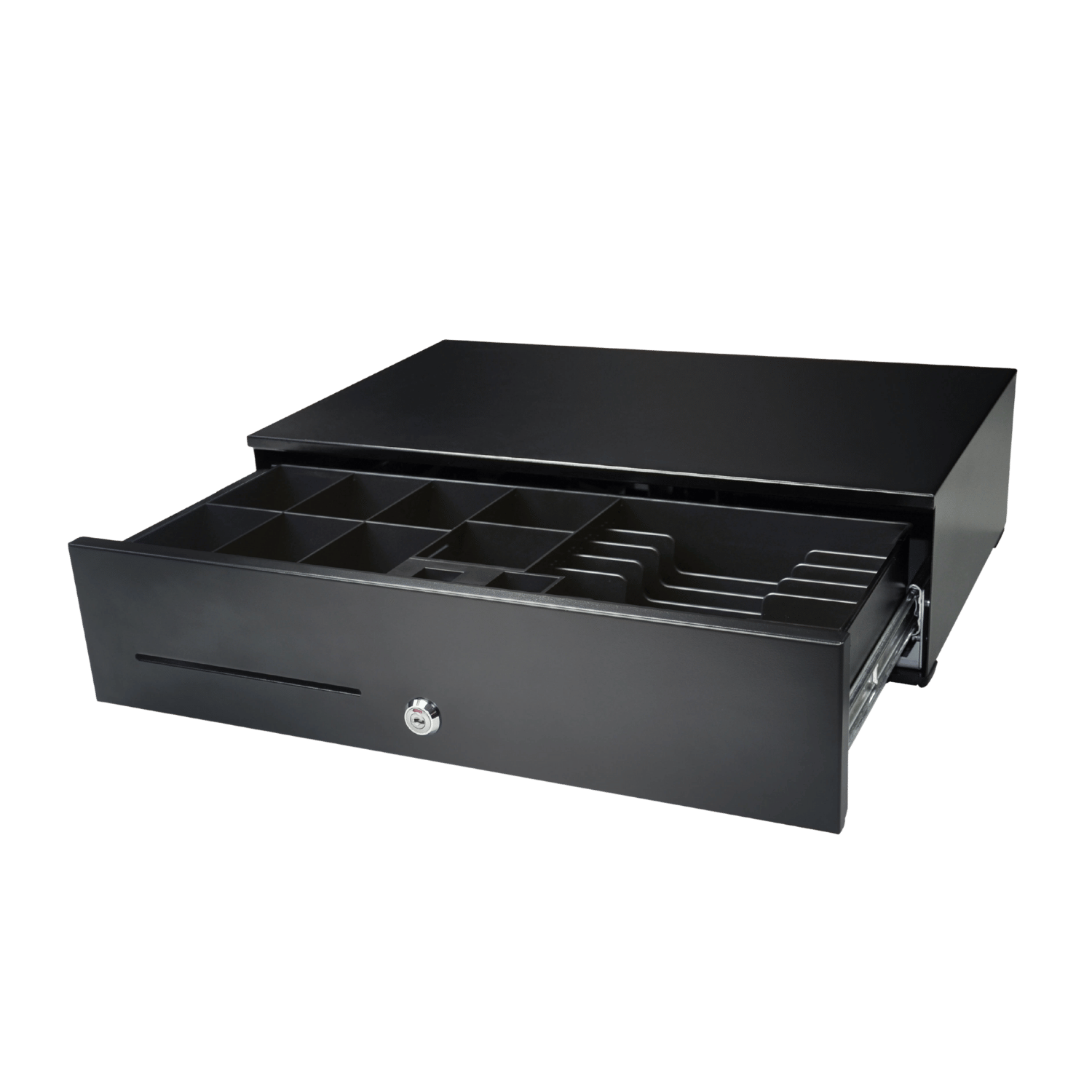 Con apertura automática y acceso frontal, incorpora 6 compartimentos para billetes y 8 para monedas, asegurando una gestión rápida y eficiente del efectivo. Además, su gaveta interna extraíble facilita el recuento y la organización en entornos de alta rotación.